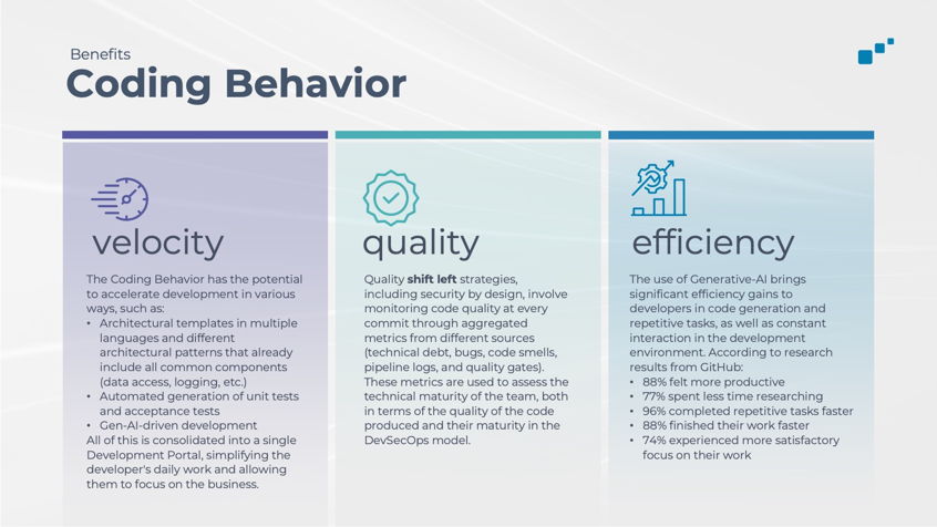A estratégia de "Coding Behavior" vai além de apenas usar ferramentas disponíveis no mercado. Sua riqueza está nos dados corporativos consolidados que fornecem uma visão global da qualidade e eficiência das operações de desenvolvimento e entrega. A escalabilidade da plataforma permite que outras unidades de negócios, independentemente de sua maturidade tecnológica, se beneficiem do comportamento adquirido, otimizando os resultados.
