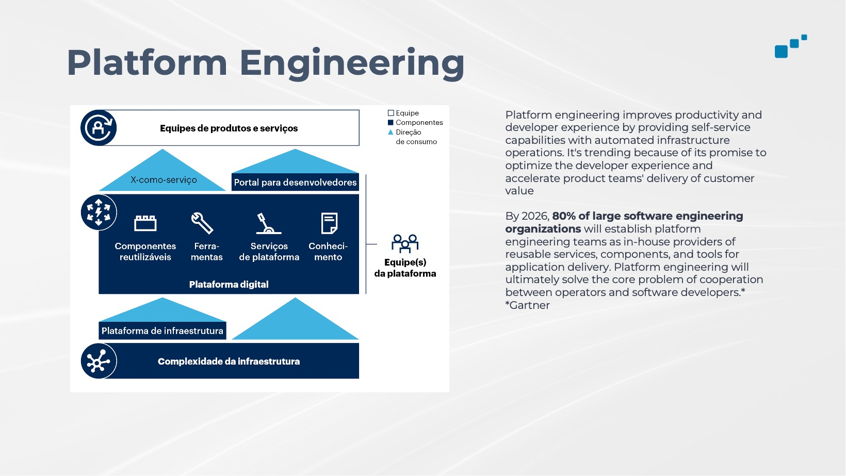 • Desenvolvimento impulsionado por IA Generativa, que simplifica o trabalho diário dos desenvolvedores, permitindo que eles se concentrem no negócio.